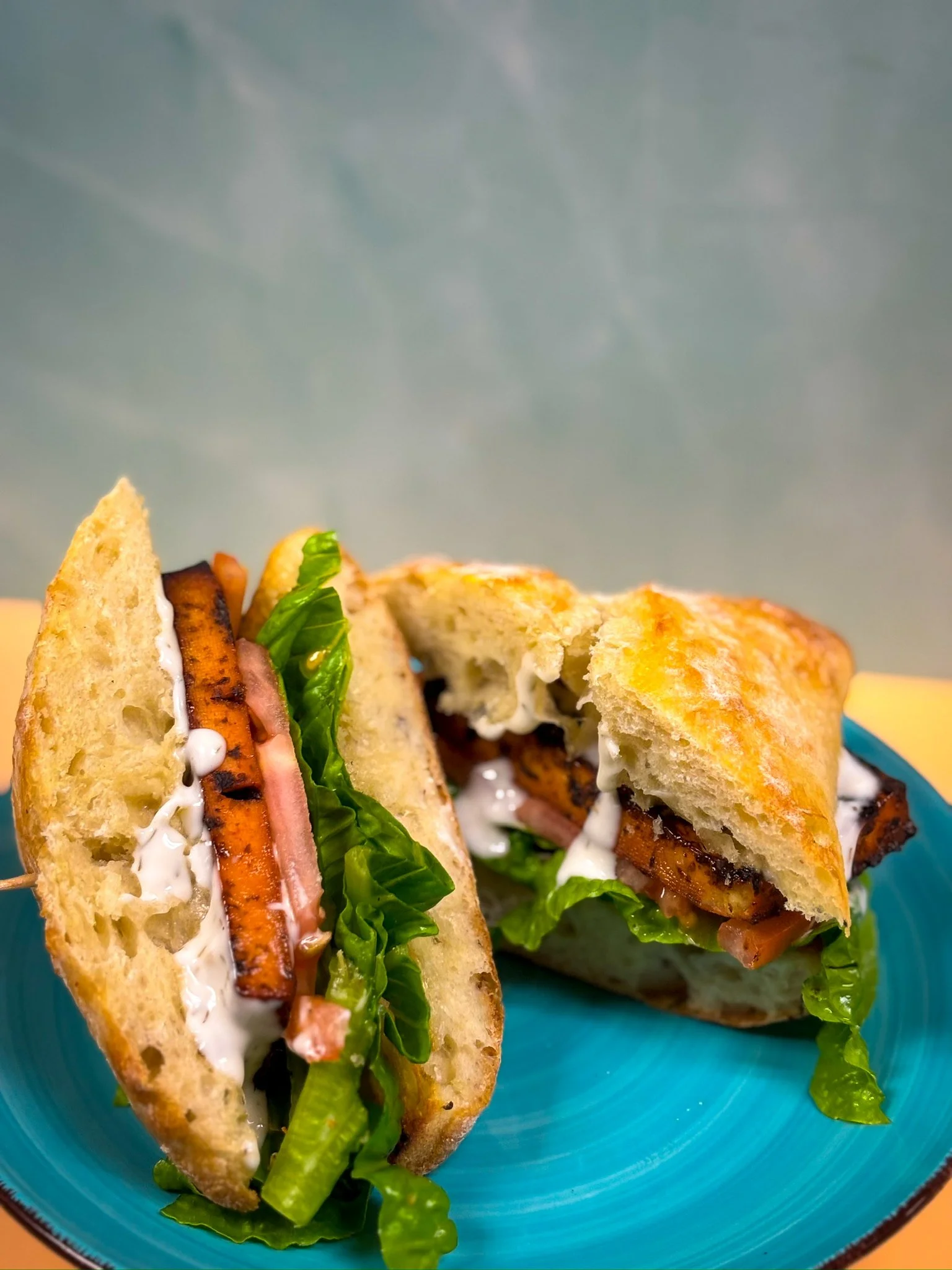 Smokey, savory, and packed with flavor - our Smokey Salmon Sandwich features house-made tofu salmon with crisp lettuce, juicy tomato, red onion, and a creamy dill mayo, all stacked on soft ciabatta bread for the perfect plant-based deli-style bite.