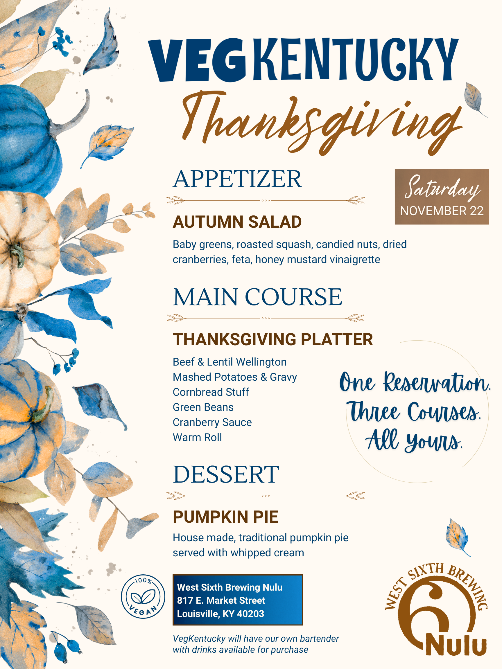 Reserve your plate below, and join us for a festive, plant-based Thanksgiving celebration in the beautiful West Sixth Nulu upstairs event space. Your ticket includes a three-course meal crafted with care — full of seasonal flavors, warmth, and comfort.